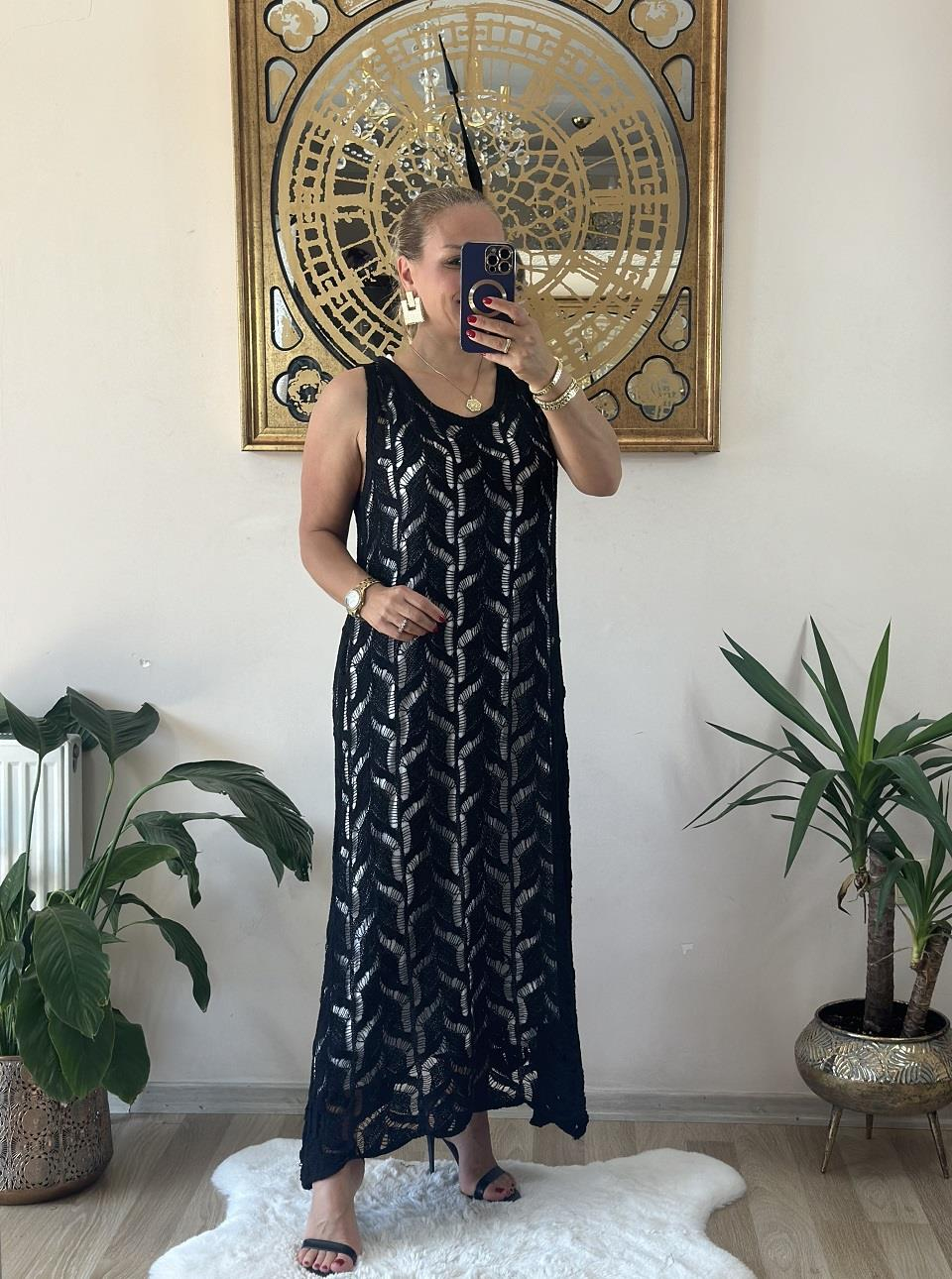 318 İkili Desenli File Elbise Siyah